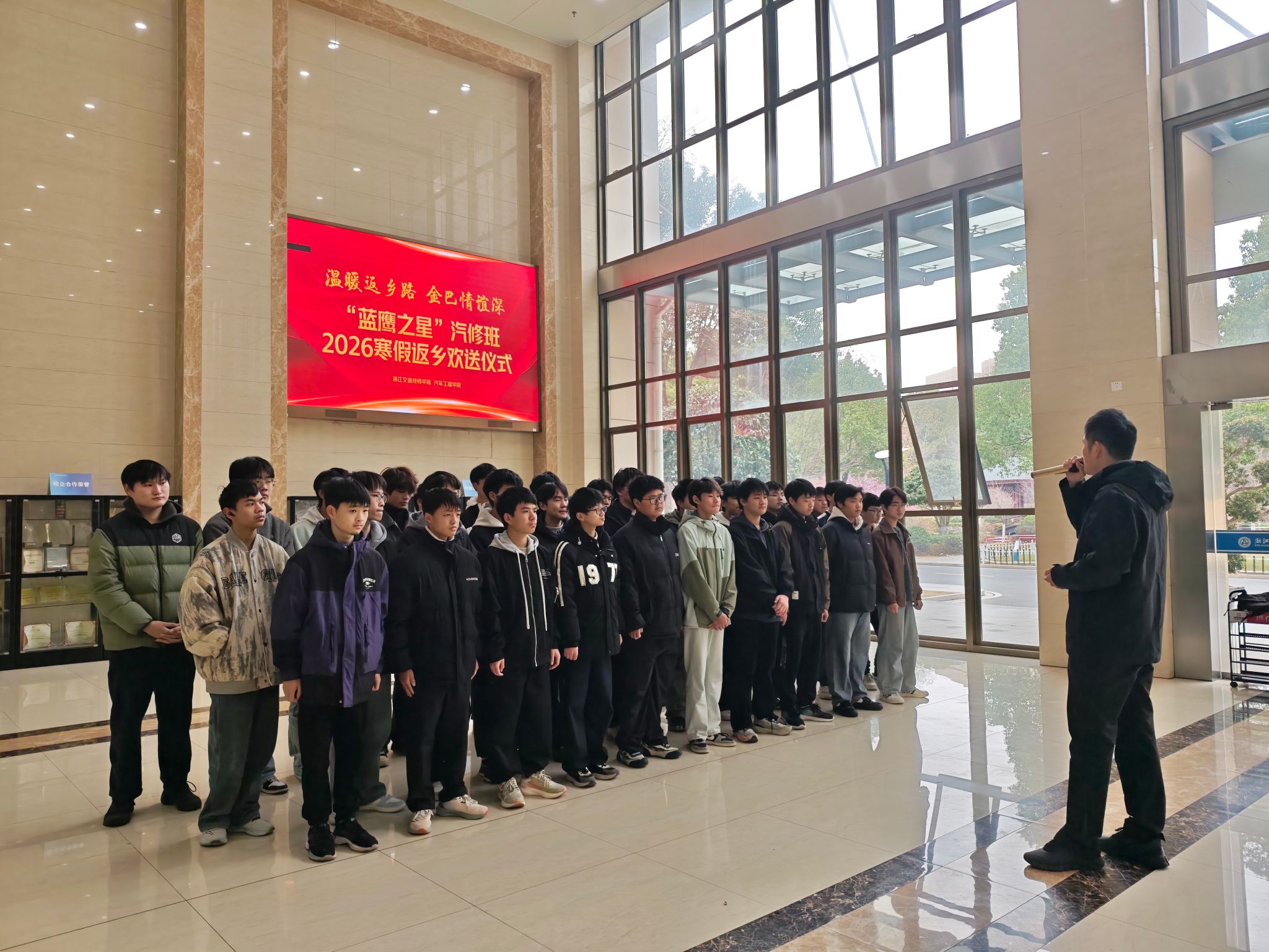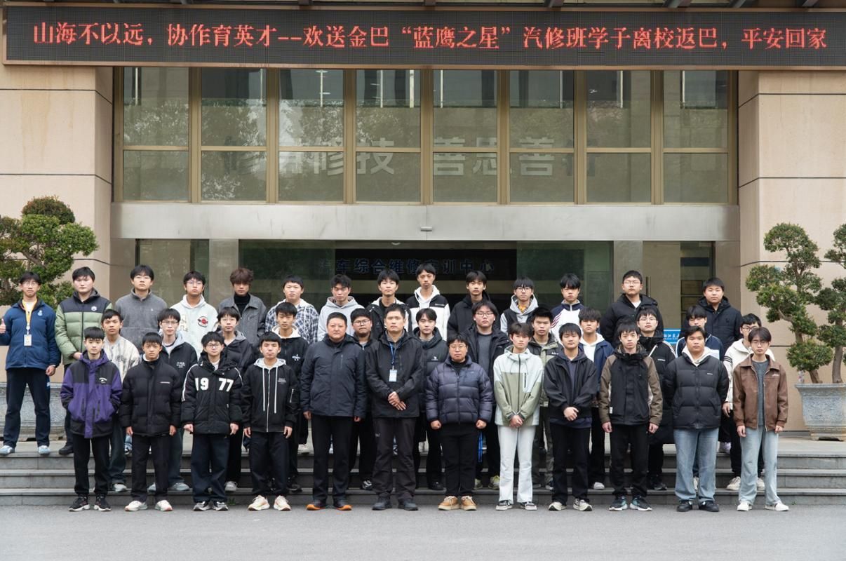 1月19日上午,汽车工程学院在精艺楼大厅为金巴“蓝鹰之星”汽修班学生举行了温馨而简短的欢送仪式。分院副院长冯冰、班主任林震到场参加,为他们送上返乡前的叮嘱与祝福,也为此次跨越千里的护送与家访工作拉开序幕。仪式结束,师生在精艺楼前合影留念,笑容温暖,情谊真挚。